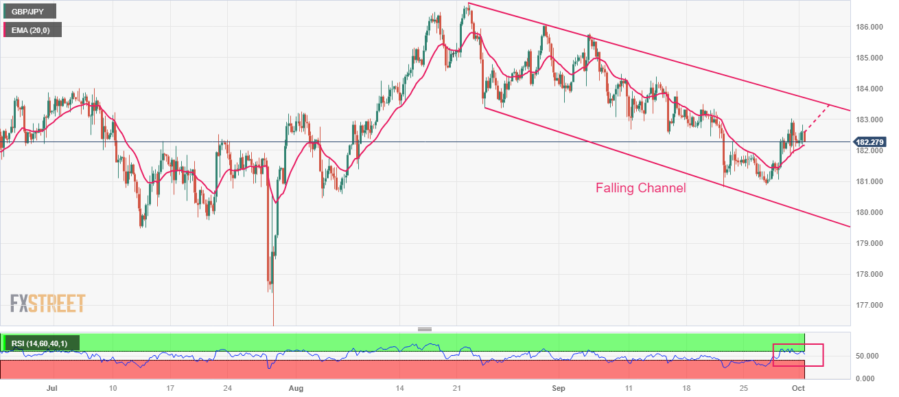 GBP/JPY trades in a Rising Channel chart pattern on a four-hour chart in which each pullback is considered a buying opportunity by the market participants. The cross rebounds from below 181.00 and climbs above the 20-period Exponential Moving Average (EMA), which trades around 182.20.