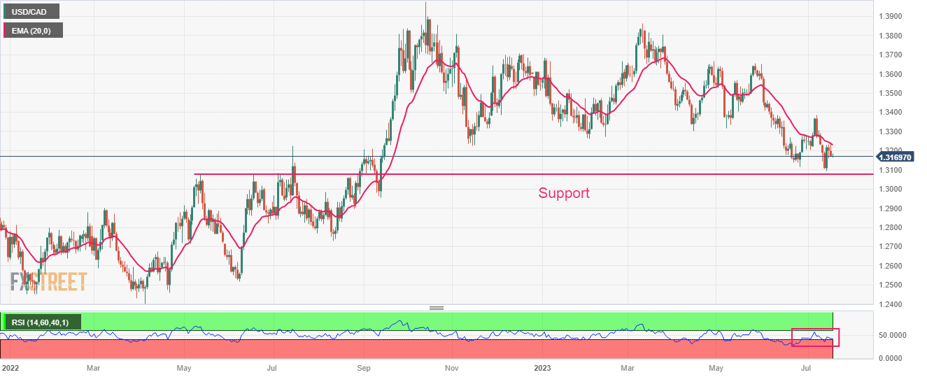 USD/CAD has faced selling pressure near the 20-period daily Exponential Moving Average (EMA) at 1.3230 after attempting a recovery move from around 1.3100. The Loonie asset is expected to continue its downside journey towards the horizontal support plotted from 12 May 2022 high at 1.3077.